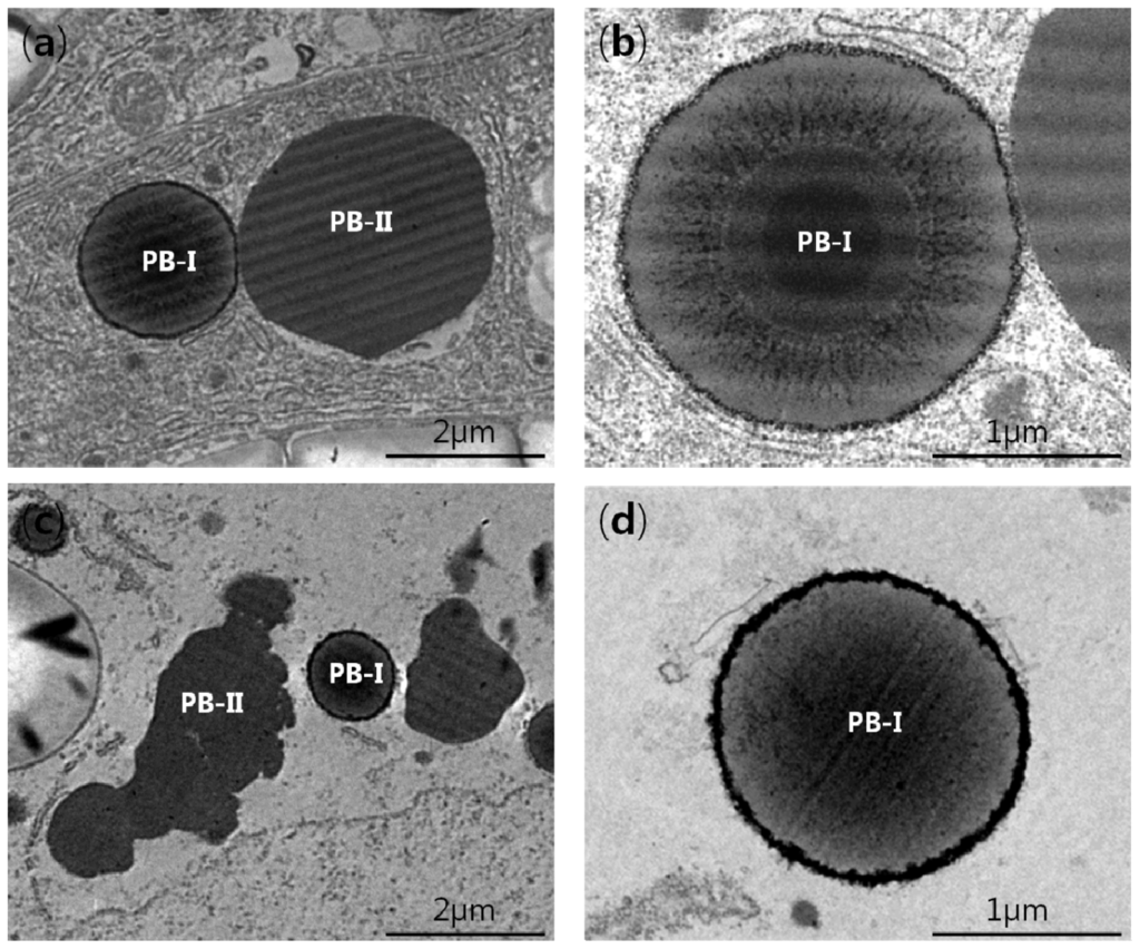 The seed storage proteins are synthesized at the rough endoplasmic reticulum (ER), translocated to the ER lumen, then transferred to separate intracellular compartments of the plant endomembrane system [3,5,13,14]. Prolamins are stored in spherical protein bodies (PBs) derived from the ER (referred to as PB-I), whereas glutelins and globulin are accumulated in irregularly-shaped PB-II bodies derived from the protein storage vacuole (PSV). PB-I is spherical in structure (diameter 1–2 μm), has a low electron density, and is surrounded by rough ER membranes having attached polysomes [5,13]. The PB-II is an irregularly shaped electron-dense structure 2–4 μm in diameter [3,12,13].