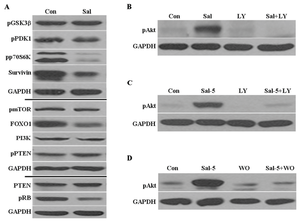 2.2. Sal Reduces Levels of Phosphorylated P70S6K, Survivin, and FOXO1