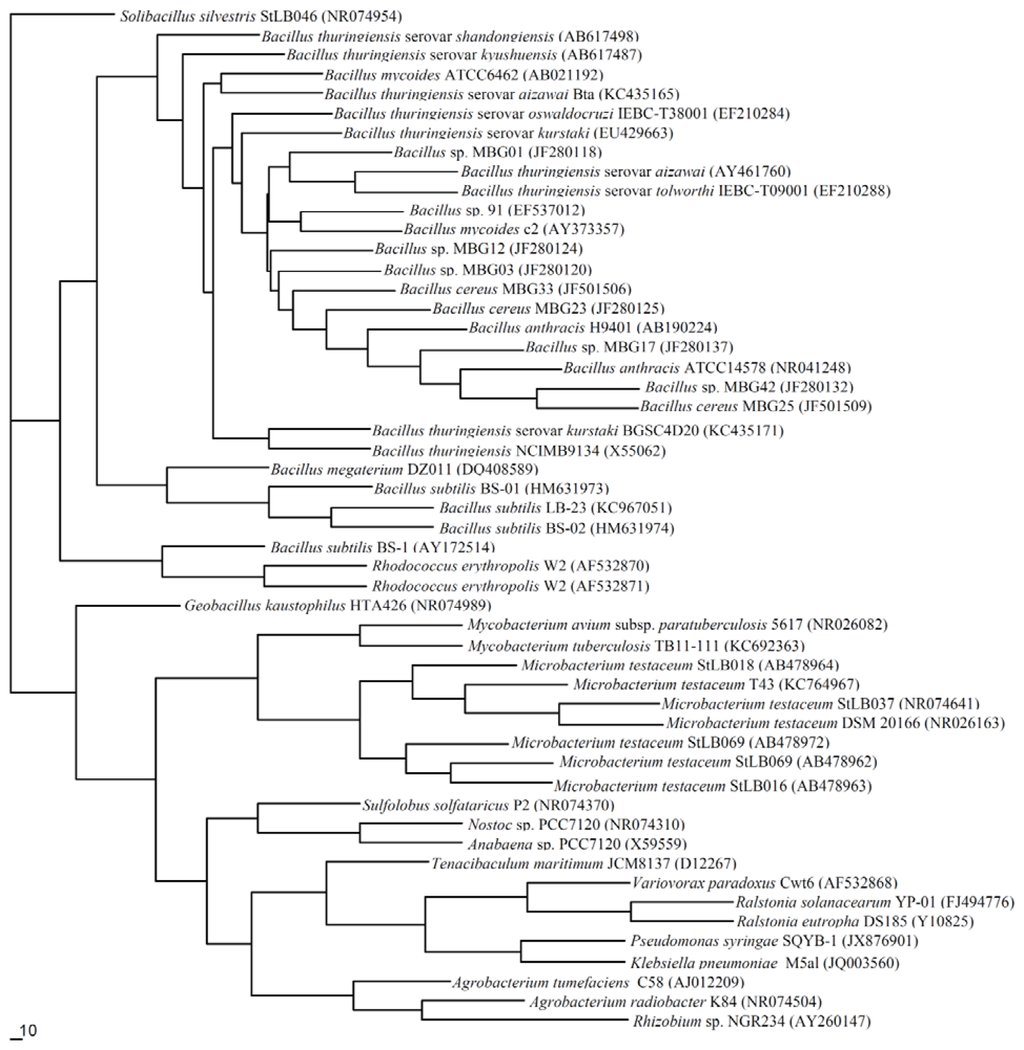 - Morohoshi, T.; Tominaga, Y.; Someya, N.; Ikeda, T. Complete genome sequence and characterization of the N-acylhomoserine lactone-degrading gene of the potato leaf-associated Solibacillus silvestris. J. Biosci. Bioeng 2012, 113, 20–25. [Google Scholar]