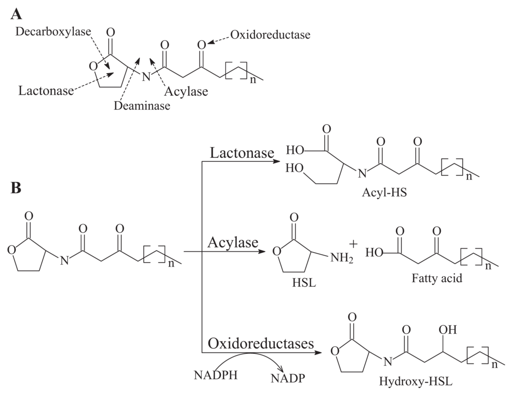 - AHL-acylase irreversibly hydrolyzes the amide linkage between the acyl chain and homoserine moiety of AHL molecules. As shown in Figure 2B, this process releases homoserine lactone and the corresponding fatty acid, which do not exhibit any residual signaling activity []. The AHL-acylase was first described in the V. paradoxus strain VAI-C, which showed a wide range of AHL degradation capacity []. Subsequently, AHL-acylases from various groups of bacteria have been reported, predominantly including AiiD in Ralstonia sp XJ12B []; AhlM in Streptomyces sp. M664 []; PvdQ and QuiP in P. aeruginosa PAO1 [,,]; and AiiC in Anabaena sp. PCC7120 []. Recently, an aac gene homologous to the AiiD acylase with undemonstrated function was identified from R. solanacearum GMI1000 []. Novel AHL-degrading genes have been isolated from the metagenomic libraries constructed from soil samples [,].