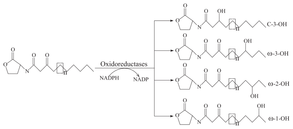 - Oxidoreductase targets the acyl side chain by oxidative or reducing activities and thus catalyzes a modification of the chemical structure of the signal but not degradation, as shown in Figure 2B. Such modification might affect the specificity and recognition of the AHL signal, thus disturbing the activation of the QS-mediated genes regulated by a particular AHL []. Long-chained AHLs and fatty acids with varying chain lengths at various positions could be oxidized. Two types of oxidoreductases have been discovered. The P-450/NADPH-P450 reductase, a previously known enzyme with fatty acids as the substrate, has been isolated from B. megaterium CYP102A1 and characterized in detail []. This substrate is capable of the efficient oxidation of AHLs at the ω-1, ω-2 and ω-3 carbons of the acyl chain to eliminate their quorum sensing activity (Figure 3). This oxidation of AHLs represents an important and different QQ mechanism: breaking AHL molecules [,]. Uroz et al. [] reported the presence of another enzyme in Rh. erythropolis W in which the 3-oxo substituent of 3-oxo-C14-HSL was reduced to yield the corresponding derivative 3-hydroxy-C14-HSL and the QS system was inactivated. Recently, a novel oxidoreductase BpiB09 derived from a metagenomic library was found to be capable of inactivating 3-oxo-C12-HSL []. Its expression in P. aeruginosa PAO1 resulted in significantly reduced pyocyanin production, decreased motility and poor biofilm formation, although AHLs are likely not the native substrate of this metagenome-derived enzyme.