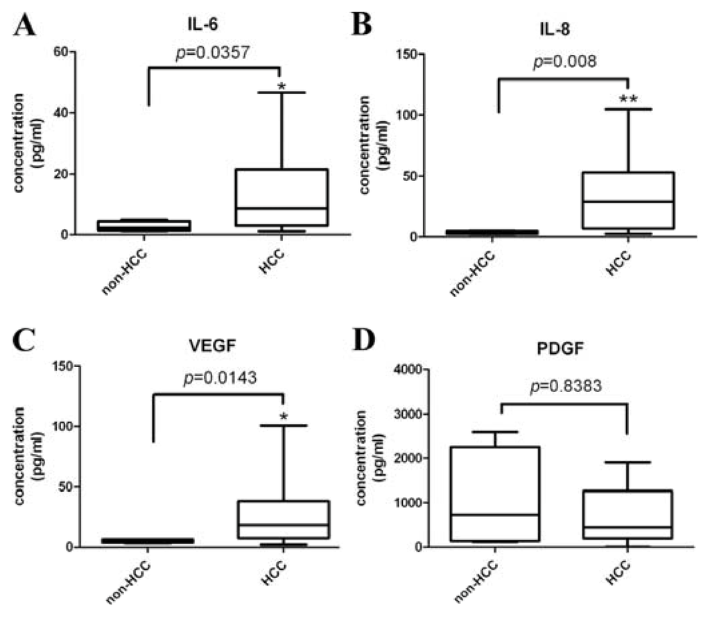 Circulating IL-6, IL-8, and VEGF were significantly higher in 21 HCC patients than eight healthy controls, (p < 0.05) (Figure 1A–C) but the PDGF did not significantly differ between these two groups (Figure 1D).