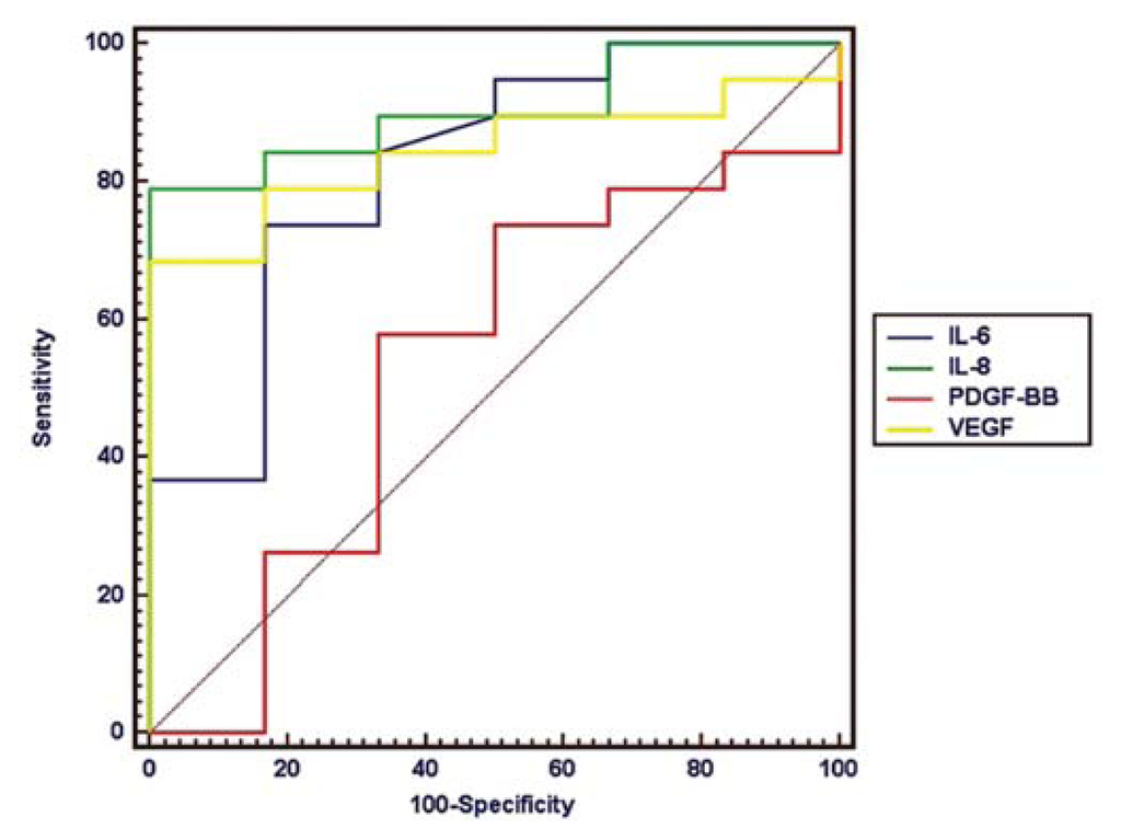 The primary difference between the previous studies and the current study is that we utilized multiplexed bead-based immunoassays for detecting the four circulating angiogenic factors in a clinical study. This assay has the advantages of a very small amount of blood sample needed, a single short diagnostic test, and multiplications for circulating proteins [29,38]. Similarly, our data indicated the circulating IL-6, VEGF, and IL-8 were sensitive and specific for predicting the occurrence of HCC among healthy controls and HCC patients [25,26,37]. However, we did not find significantly increased circulating PDGF in HCC patients.