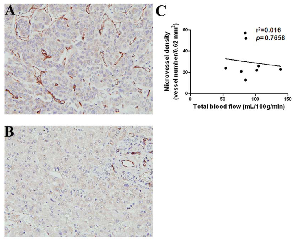 The measured region of interest (ROI) of HCCs showed higher arterial fraction (p < 0.001), lower portal BF (p < 0.001), and lower total BF (p = 0.002) than that of the surrounding liver parenchyma. There was no significant difference in arterial BF between the HCCs and surrounding liver parenchyma. These results suggested that BF in HCC was differentiated from that in the surrounding liver parenchyma. To examine if quantitative CT perfusion parameters was correlated with MVD, which was used as an indicator for evaluation of tumor angiogenesis, immunohistochemistry (IHC) with anti-CD31, a vascular marker, was conducted. The HCC sections with increased numbers of CD31-positive staining vessels in hot-spot regions demonstrated distinctly increased neovascularity compared to the surrounding liver parenchyma (Figure 3A,B). Following manual calculation, the MVD in HCCs (n = 8) did not show any significant correlation with the CT perfusion parameters (Table 2), such as total BF (Figure 3C).