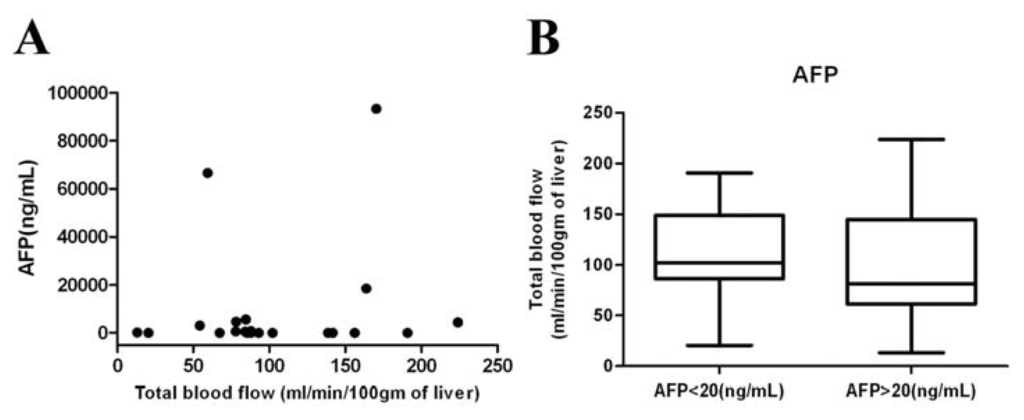 Relationships between alpha-fetoprotein (AFP) levels and total BF. (A) No correlation was detectable between plasma AFP and total BF, parameter of CT perfusion in HCCs (r = 0.2826, p = 0.2146); (B) Box plots of the total BFdistribution between patients with normal (AFP < 20 ng/mL, n = 9) and abnormal AFP (AFP > 20 ng/mL, n = 12). No significant difference was detected between the two groups of HCCs (p = 0.06).