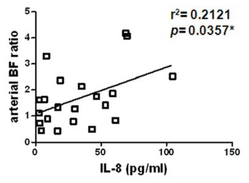 A correlation between the HCC-parenchyma ratio of arterial BF and level of circulating IL-8. There was a significant positive correlation (r = 0.46, p = 0.0357) between the HCC-parenchyma ratios of arterial BF and circulating IL-8. *p < 0.05.