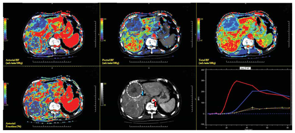 Data on the CT perfusion of the target HCC among 21 patients were analyzed at a commercially available workstation (MIStar, Apollo Medical Imaging, Melbourne, Australia) by two experienced radiologists (J.-S.H. and C.-P.C.), specializing in liver imaging for more than 14 years. Region of interest (ROI) placement was determined based on the consensus of the two radiologists. The definitions of the CT perfusion parameters and the models were used for generating functional CT perfusion maps. The commonly used two-compartment model regards the extracellular space and plasma as two compartments that are individually well mixed [53]. The Materne-van Beers Liver Model, including singular deconvolution analysis of the hepatic artery and portal flow, will be used in data analysis [53]. HCC vascular functional maps of total BF, arterial BF, portal BF, and arterial fraction were generated on a workstation (Figure 7). BF measured with CT perfusion imaging reflects the intratumoral BF supplied by the total dual BF (sum of arterial BF and portal BF), hepatic artery (arterial BF), portal vein (portal BF), and arterial fraction (arterial BF/total BF).