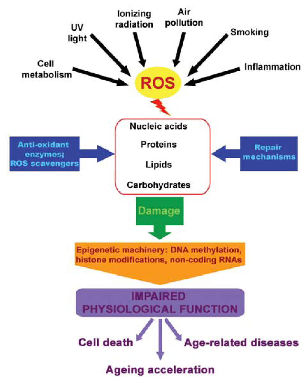 Oxidative stress, epigenetics and ageing. ROS, reactive oxygen species.