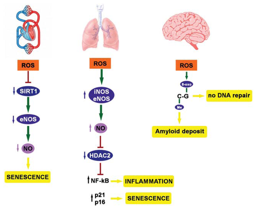 Besides the cardiovascular system, lungs are exposed to either endogenous or exogenous sources of oxidants. The endogenous oxidants predominantly derive from mitochondrial respiration and phagocyte activation, whereas important exogenous determinants of oxidation are air pollutants, noxious gases and, last, but not least, the smoke of cigarettes [61,62]. The accumulation of ROS directly impairs the function of lung cells, determining posttranslational modifications of histones and non-histone proteins, as well as that of chromatin remodeling enzymes [61,62]. The lung disease in which all these mechanisms are the most evident is chronic obstructive pulmonary disease (COPD) characterized by chronic low-grade systemic inflammation and premature ageing, the so-called “inflamm-ageing”, which determines the obstruction of lung airflow and decreases respiratory function [63]. In these patients, inflammation and cellular senescence are exacerbated by tobacco smoke, which accelerates or induces premature lung ageing [63–65]. Indeed, cigarette smoke contains a number of free radicals and chemical compounds, representing the major source of inhaled ROS, able to alter the intracellular balance between acetylation/deacetylation and methylation/demethylation processes, leading to a deregulated expression of proinflammatory genes [64,65]. Specifically, it has been recently found that cigarette smoke post-translationally modifies histone deacetylase 2 (HDAC2), a class I histone deacetylase, causing a significant reduction in its enzymatic activity [64]. Adenuga et al. [66] observed a smoke-dependent HDAC2 inactivation by phosphorylation at Ser394, Ser411, Ser422 and Ser424 in macrophages, human bronchial and primary small airway lung epithelial cells and, in vivo, in the mouse lung. In this context, it is the caseine protein kinase 2 (CK2) that induces HDAC2 phosphorylation, leading to its inactivation by ubiquitination and degradation via the proteasome pathway. This physiopathological condition is associated with severe unfavorable effects, such as steroid resistance and abnormal inflammation [66]. Besides phosphorylation, HDAC2 can be modified and inactivated by smoke-induced carbonyl stress and NO-dependent S-nitrosylation at cysteine [67,68]. Indeed, in the mouse lung, tobacco smoke increases inducible NOS (iNOS) and eNOS expression and function, respectively, with a consequent increment of NO generation [69]. In this regard, we reported that a deregulated NO synthesis in mice expressing a constitutively active form of eNOS leads to S-nitrosylation of HDAC2, with a subsequent loss of its deacetylase activity [70]. A decreased HDAC2 activity has been associated with inflammation and senescence in COPD patients via the increase of histones H3 and H4 acetylation, the activation of the transcription factor, nuclear factor of kappa light polypeptide gene enhancer in B-cells 1 (NF-κB), and the unscheduled transcription of proinflammatory genes [66,71,72]. Moreover, HDAC2 activity normally delays cellular senescence by negatively regulating pro-senescent genes, such as cyclin-dependent kinase inhibitor 1A (p21) and cyclin-dependent kinase inhibitor 2A (p16) [64]. Therefore, a significant reduction in HDAC2 function may accelerate cellular senescence and pulmonary emphysema in COPD patients (Figure 2).