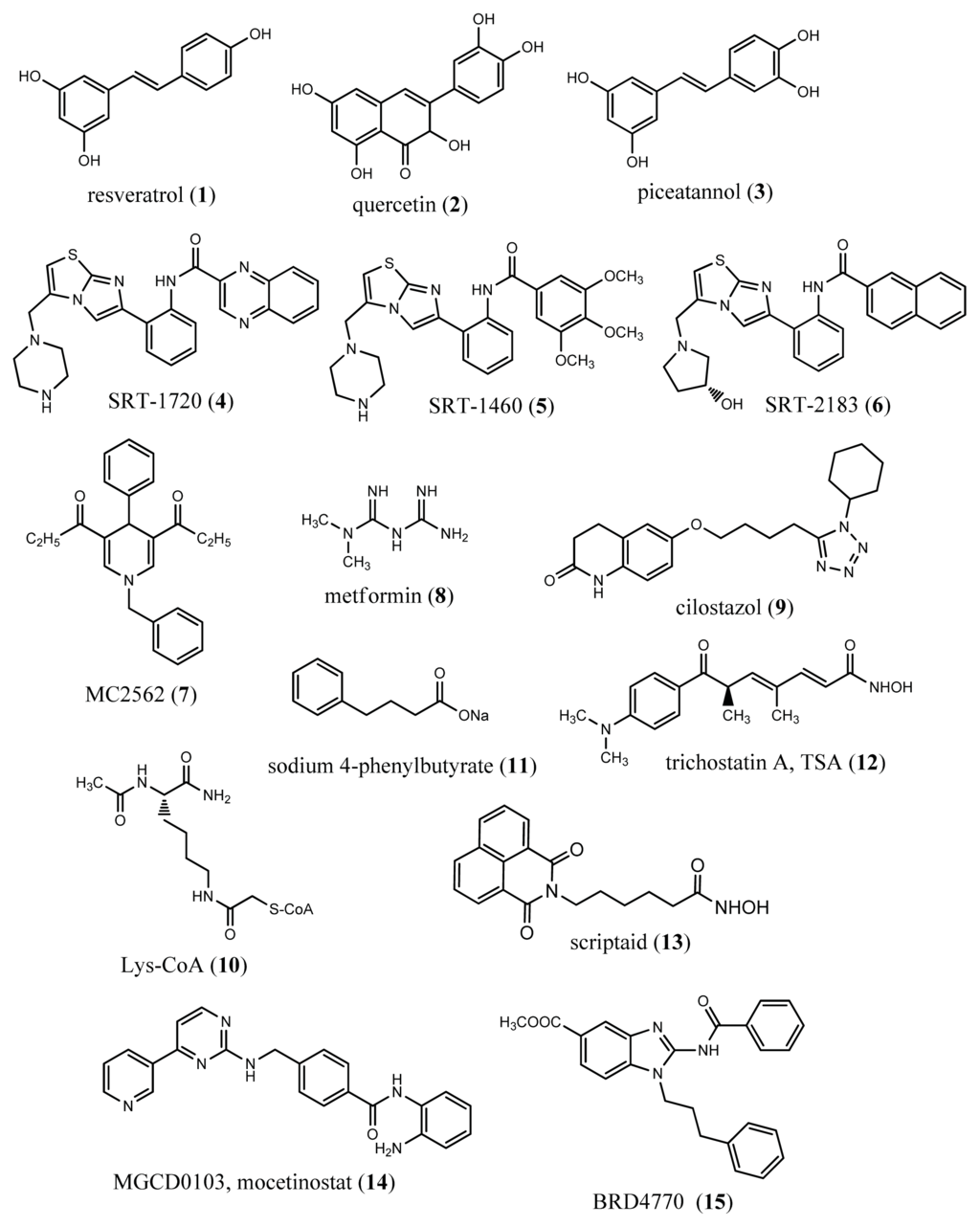 Since 2003, resveratrol (see 1 in Figure 3) has been identified as a potent SIRT1 activator that mimics the effect of caloric restriction and regulates longevity in yeast, worms, flies, short-lived fish and mice [96]. In obese rodents, treatment with resveratrol produces a variety of health benefits, including improved metabolic and vascular function, decreased hepatic steatosis, reduced inflammation and improved endurance. Recent clinical studies showed that resveratrol also confers metabolic benefits to humans. In obese humans, one month of resveratrol supplementation, in fact, induced metabolic changes, mimicking the effect of caloric restriction. This beneficial effect has been associated with the positive effect of resveratrol on SIRT1 and the consequent reduction of cellular senescence and inflammation [97]. Resveratrol is currently being evaluated in clinical trials for the treatment of several ageing-related pathologies (see Table 2 for details).