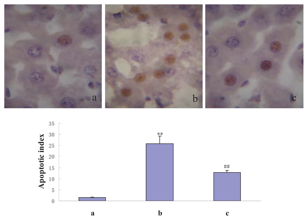 Effects of I/R and NAS treatment on apoptotic index. (a): sham, the mice subjected to all surgical procedures except for liver I/R; (b): I/R, the mice underwent the liver I/R operation; and (c): I/R + NAS, NAS (5 mg/kg) was administered by i.p. injection 30 min before ischemia. Note the significantly higher rate of apoptosis in the I/R group compared with the sham group (p < 0.01) and the lower rate in the I/R + NAS group compared with the I/R group (p < 0.01). Error bars represent SD (n = 6). The annotation ** indicates a p value < 0.01 vs. sham group. The annotation ## indicates a p value < 0.01 vs. I/R group. [(a–c): 1000×].