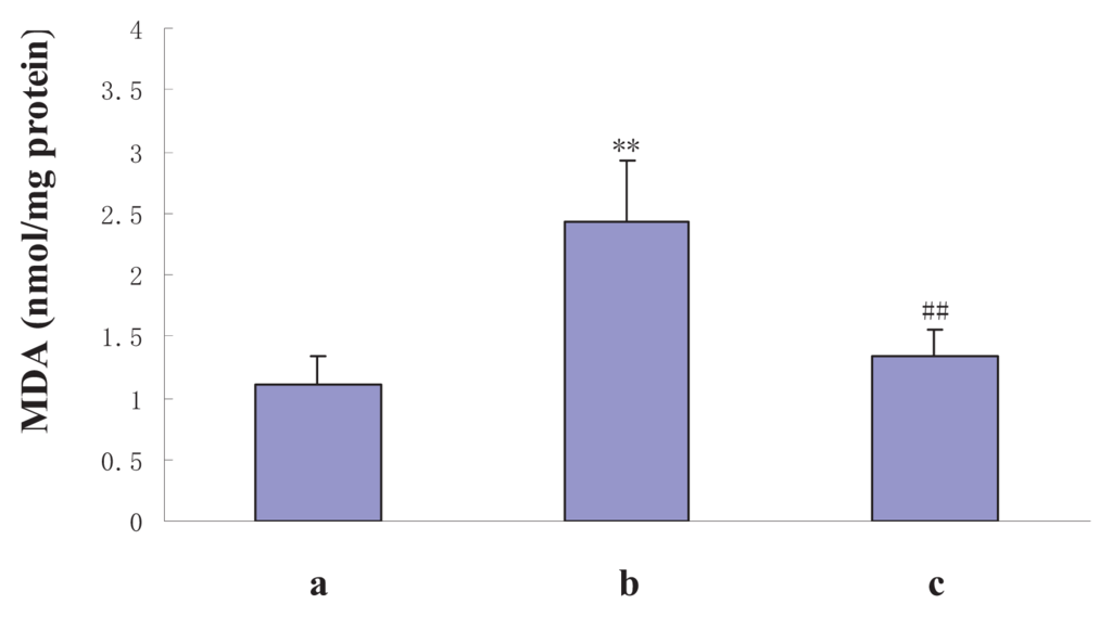 Effects of I/R and NAS treatment on MDA levels. (a): sham, mice were subjected to all surgical procedures except for liver I/R; (b): I/R, the mice underwent the liver I/R operation; and (c): I/R + NAS, NAS (5 mg/kg) was administered by i.p. injection 30 min before ischemia. Note the significant increase in MDA in the I/R group compared with the sham group (p < 0.01) and the decrease in the I/R + NAS group compared with the I/R group (p < 0.01). Error bars represent SD (n = 6). The annotation ** indicates a p value < 0.01 vs. sham group. The annotation ## indicates a p value < 0.01 vs. I/R group.
