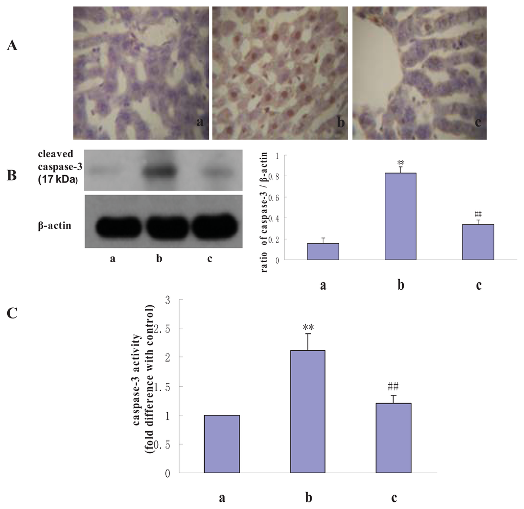 Liver samples were collected and rinsed with PBS, lysed in lysis buffer for 15 min on ice, then centrifuged at 20,000× g for 10 min at 4 °C. Caspase-3 activity in the supernatant was assayed with commercially available kits obtained from the Beyotime Institute of Biotechnology according to the manufacturer’s instructions. All experiments were carried out in triplicate.