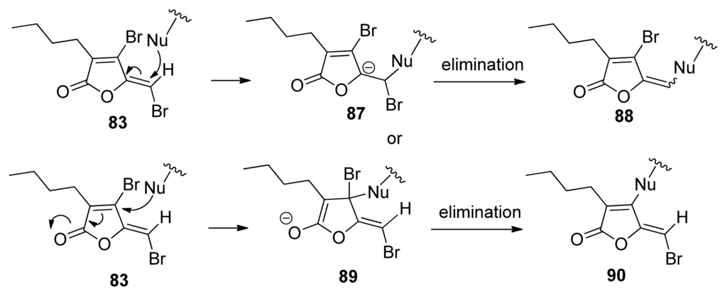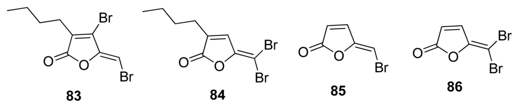 A series of naturally occurring brominated furanones were isolated from the red marine alga Delisa pulchra by Gram, Givskov et al. in 1996 [,]. These have been shown to be potent anti-biofilm and anti-QS inhibitors [,]. Zhou and co-workers have shown that brominated furanones, such as 83–86 (Figure 11), are LuxS covalent inhibitors of LuxS (see Scheme 10 for proposed mechanism of inhibition) []. Brominated furanones do not only inhibit LuxS but also other proteins involved in AI-1 perception []. A recent study showed that analogs of brominated furanones, with attenuated toxicity, have interesting anti-biofilm properties against E. coli and P. aeruginosa [].