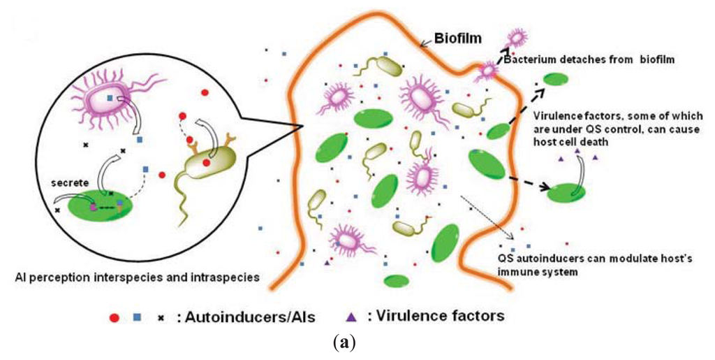 (a) Increased concentration of autoinducers in bacterial biofilms promotes the synthesis of biofilm matrices, such as adhesion proteins and polysaccharides, which are required for the maintenance of the biofilm structure; (b) Autoinducers repress the production of virulence factors as well as the synthesis of the components of the bacterial secretory system, such as T3SS, in some bacteria (for example, AI-1, AI-2 and CAI-1 represses T3SS gene expression in V. harveyi []).