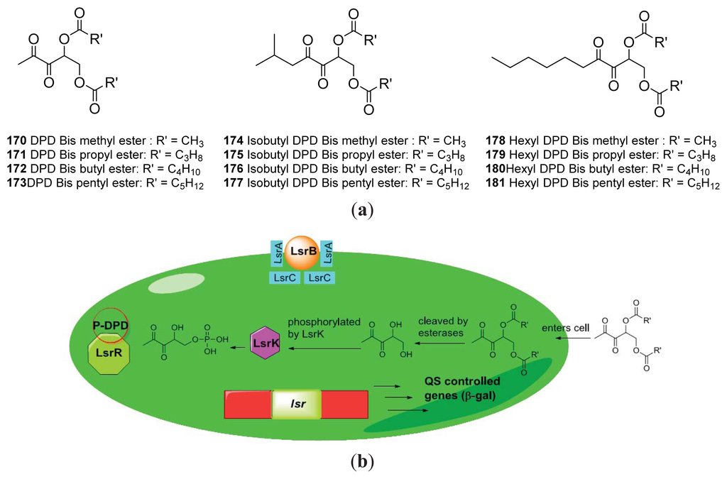 Apart from the inhibition of AI-2 synthesis, others have also suggested the sequestration or modification of AI-2 as a viable means to quench AI-2 signaling. For example, Bentley and co-workers demonstrated a proof-of-concept modification of AI-2 in culture media, using the kinase LsrK and ATP []. The phosphorylated AI-2 was then unable to cross into the bacterial cytosol and hence, AI-2 signaling was quenched. Alexander and co-workers have also sequestered AI-2 from bacterial culture media by using polymeric material that contains boron, which chelates AI-2 [].