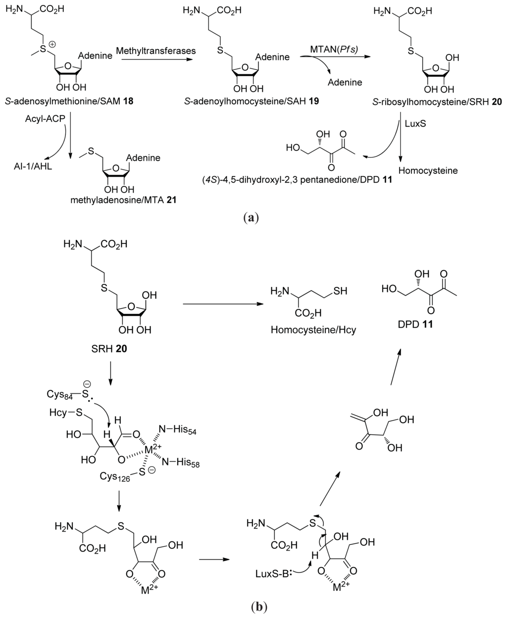(a) Biosynthetic route to DPD; (b) Mechanism of LuxS-catalyzed transformation of SRH into DPD (Adapted from [] with permission. Copyright 2009, Elsevier).