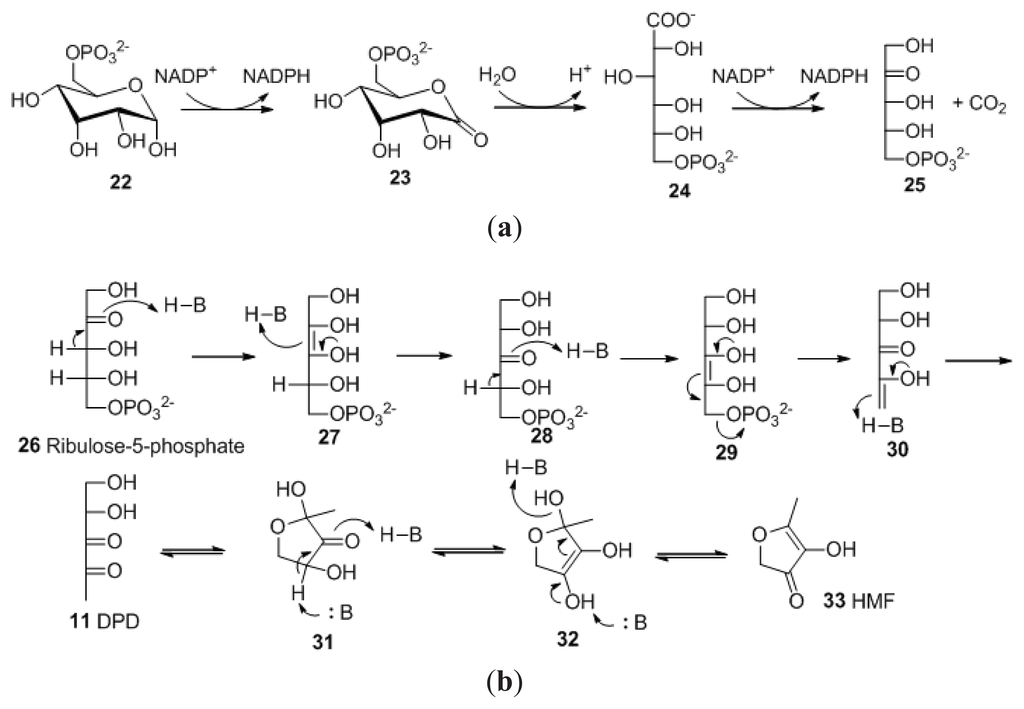(a) Generation of d-ribulose-5-phosohate in the OPP pathway; (b) Degradation pathway of Ru5P to form 4,5-dihydroxy-2,3-dipentadione and HMF.