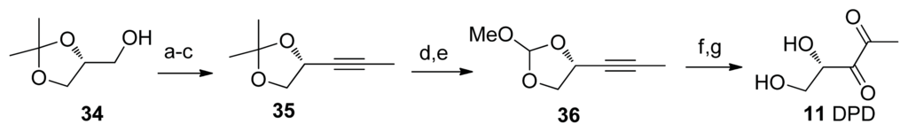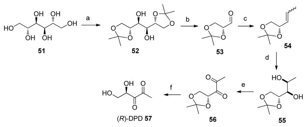 Gardiner and co-workers reported a new synthesis of DPD, which could be used to make both the unnatural (R)-DPD, as well as natural (S)-DPD (Scheme 8). [] Their synthesis started from inexpensive d-mannitol 51, which was protected with an acetal group and then cleaved with NaIO4 to provide aldehyde 53 in 43% yield over two steps. Wittig olefination of 53 gave alkene 54 as a mixture of E and Z olefins (70% yield). The lack of control of the alkene geometry was inconsequential because dihydroxylation of both alkenes afforded diastereoisomeric diols 55, and the mixture was subjected to PCC oxidation to converge to diketone 56. Deprotection of compound 56 with acid then afforded (R)-DPD in a 6.3% overall yield. Natural (S)-DPD could be obtained via the same route, using the enantiomer of 53. It has been observed that the absolute configuration at C4 of AI-2 is important for biological activity; in both E. coli LsrR-mediated β-gal assay and V. harveyi bioluminescence assays, the natural (S)-DPD was more potent than the unnatural (R)-DPD [,,].