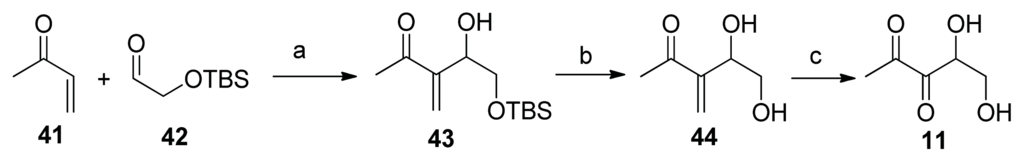 Doutheau published a short, three-step synthesis of AI-2 based on the Baylis-Hilman reaction (Scheme 5) []. Commercially available silyl protected aldehyde 42 and enone 41 afforded Baylis–Hilman product 43 in 74% yield. 43 was then deprotected by TBAF to give diol 44 in a 78% yield. Compound 44 was then subjected to reductive ozonolysis, using dimethyl sulfide, to give racemic DPD in an overall yield of 58%. Vanderleyen and co-workers reported a convenient synthesis of AI-2 starting from commercially available acetal ester 45, which was transformed into an olefin 47 in two steps (Scheme 6). Hydrolysis of the dioxolane ring in 47 on an acidic Dowex resin to give α,β-unsaturated carbonyl 44, followed ozone-mediated cleavage of the double bond to give DPD (Scheme 6) [].