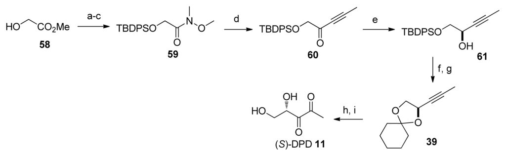 Maycock and co-workers have also reported a synthesis of (S)-DPD but unlike most enantioselective DPD syntheses that relied on using chiral starting materials, their synthesis used an enantioselective reduction of unsaturated ketone 60 as a key step (Scheme 9) []. Hydroxy ester 58 was protected with tert-butyldiphenylsilyl group and transformed into Weinreb amide 59 (78% over three steps). Then, the acetylenic group was incorporated via a reaction between the Weinreb amide 59 and lithiated propyne to give 60. Treatment of 60 with (S)-Alpine borane yielded (R)-61 with 86% ee (>98% ee after recrystalization). Then, the silyl protecting group was removed and the diol product was reprotected with cyclohexylidene group to get 39. Conversion of 39 into DPD followed protocols developed by Semmelhack and Vanderleyen to give (S)-DPD in an overall yield of 41%. Of note, compound 39 was first made by Semmelhack and co-workers, so this synthesis of DPD (which entails nine steps, Semmelhack’s synthesis involved seven steps from l-gulonic acid γ-lactone) can be considered as a formal synthesis. With so many different and complementary AI-2 syntheses developed over the years, it should now be possible to make various AI-2 analogs for biological testing.