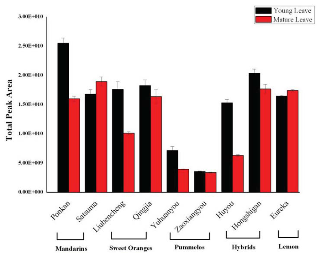 Differences in total amount of leaf volatiles, measured by GC-MS total ion current peak area, were observed between citrus types and, to a lesser extent, between cultivars, as well as between leaf developmental stage, especially in Ponkan, Liubencheng, Yuhuanyou and Huyou (Figure 1). The lowest amount of volatiles was found in either young or mature leaves of pomelos, and there was no marked difference between the other cultivars (Figure 1), except that, in general, young leaves produced higher amounts of volatiles than mature leaves (Figure 1).