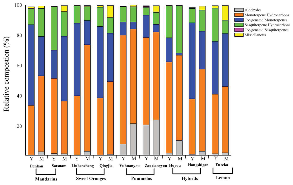 Relative composition (%) of major chemical groups from young (Y) and mature (M) leaves of five citrus types: mandarins (Ponkan, Satsuma), sweet oranges (Liubencheng, Qingjia), pomelos (Yuhuanyou, Zaoxiangyou), hybrids (Huyou, Hongshigan) and lemon (Eureka).