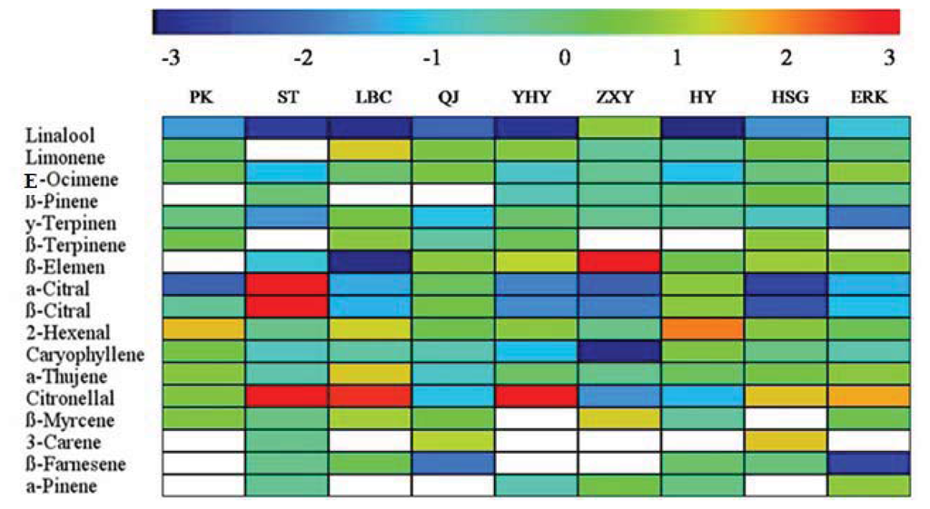 2.3. Variation in Volatile Constituents from Nine Citrus Cultivars