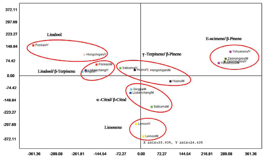 Principle component analysis of both young (Y) and mature (M) leaf volatiles from citrus cultivars.