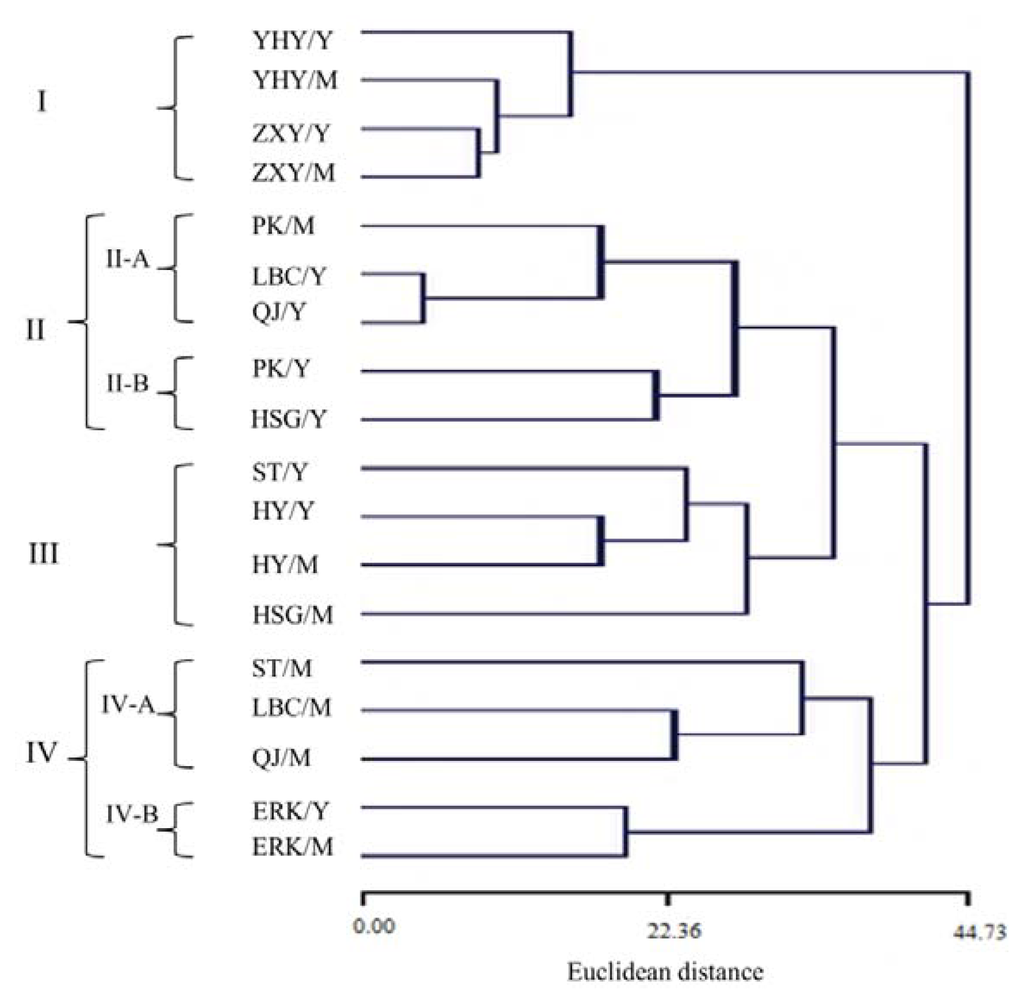 Multivariate analysis is one of the most appropriate approaches to evaluate variations or diversity of leaf volatiles during leaf development from a range of cultivars. In the present study, the complete data set was selected for principle component analysis (PCA) and hierarchical cluster analysis (HCA) and was performed on average contents of all compounds from each cultivar regardless of developmental stage. The PCA horizontal and vertical axis explained 35.93% and 24.43% of total variance, respectively, and suggested the existence of six clusters from nine cultivars (Figure 4). The dendrogram based on Euclidean distance between cultivars performed on leaf volatiles showed four major groups, with subgroups in groups II and IV (Figure 5).