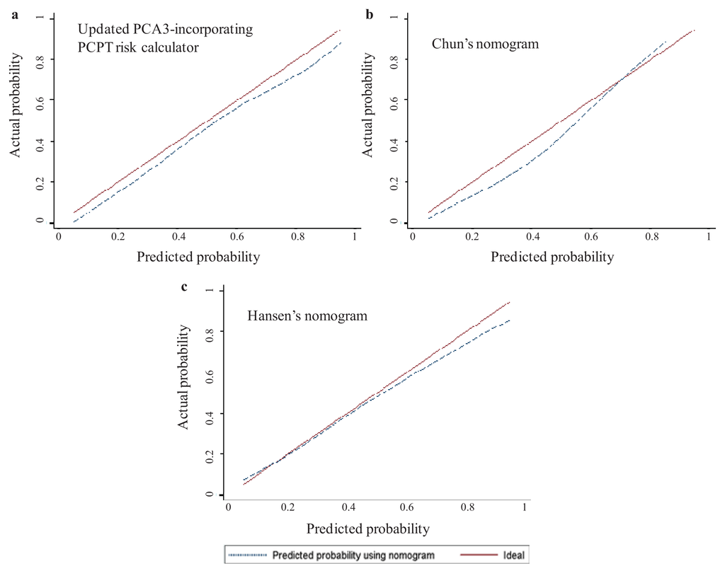 Calibration plots within external validation cohort using the three available urinary PCA3-based nomograms (n = 536 patients): (a) PCA3, including updated Prostate Cancer Prevention Trial risk calculator [20]; (b) Chun’s nomogram [21]; and (c) Hansen’s nomogram [14].