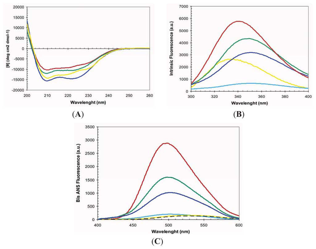 3.4. Circular Dichroism and Intrinsic Tryptophan Fluorescence