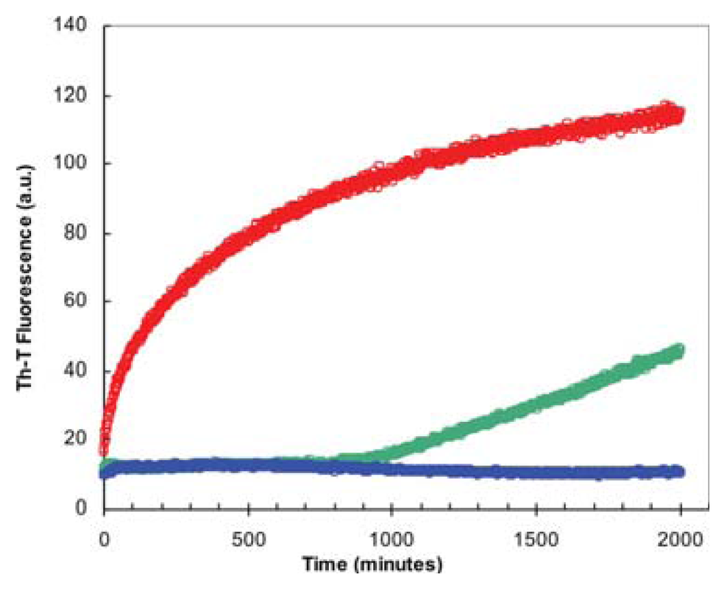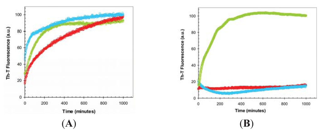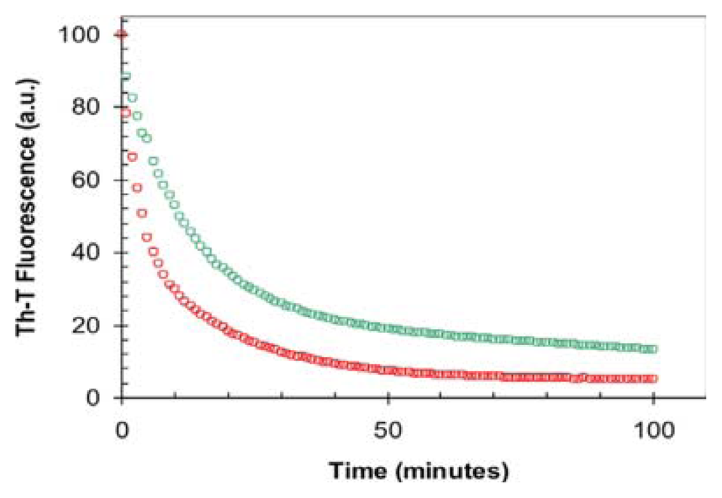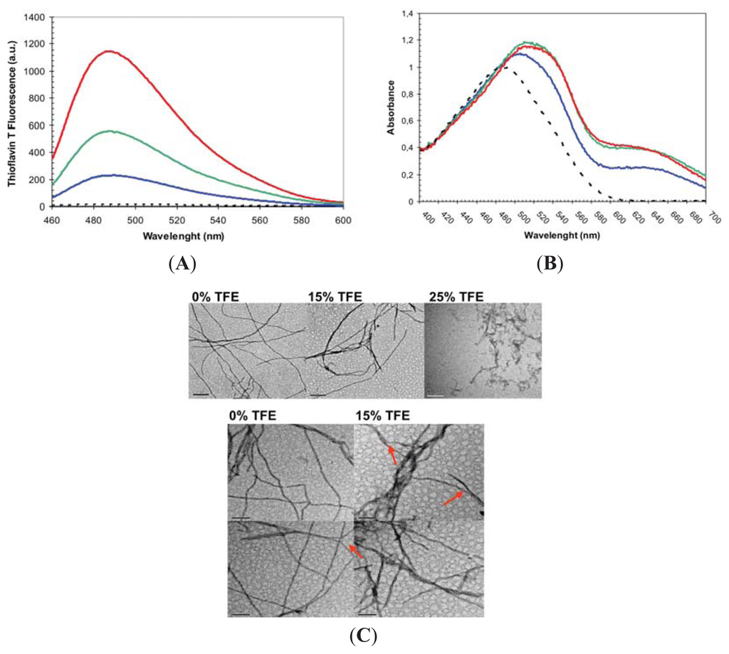 Ten percent (v/v) of preformed fibrils formed under different conditions were diluted 5-fold in 100 mM glycine at pH 2.5 containing 15% of TFE (v/v). The sample was excited at 440 nm and emission was recorded at 475 nm for ThT. Slitwidths of 5 nm and 10 nm were used for excitation and emission respectively in a CARY-100 Varian spectrophotometer (Varian, Inc., Palo Alto, CA, USA). ThT intrinsic fluorescence was measured every minute.