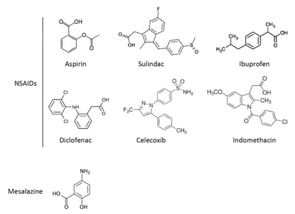Chemical structures of common non-steroidal anti-inflammatory drugs (NSAIDs) and mesalazine.