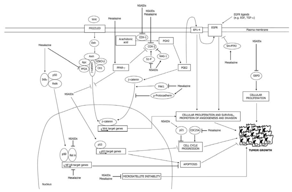Colorectal cancer (CRC) is the third most common malignant neoplasm worldwide. Although conclusive evidence is still lacking, epidemiologic studies suggest that long-term use of non-steroidal anti-inflammatory drugs (NSAIDs) has chemopreventive properties against CRC. Similarly, regular consumption of mesalazine, a drug structurally related to NSAIDs, seems to reduce the risk of CRC in patients with ulcerative colitis. These observations are supported by a large body of experimental data showing the ability of such drugs to inhibit multiple pathways that sustain colon carcinogenesis. This review summarizes the current information on the molecular mechanisms by which NSAIDs and mesalazine could interfere with CRC cell growth and survival.