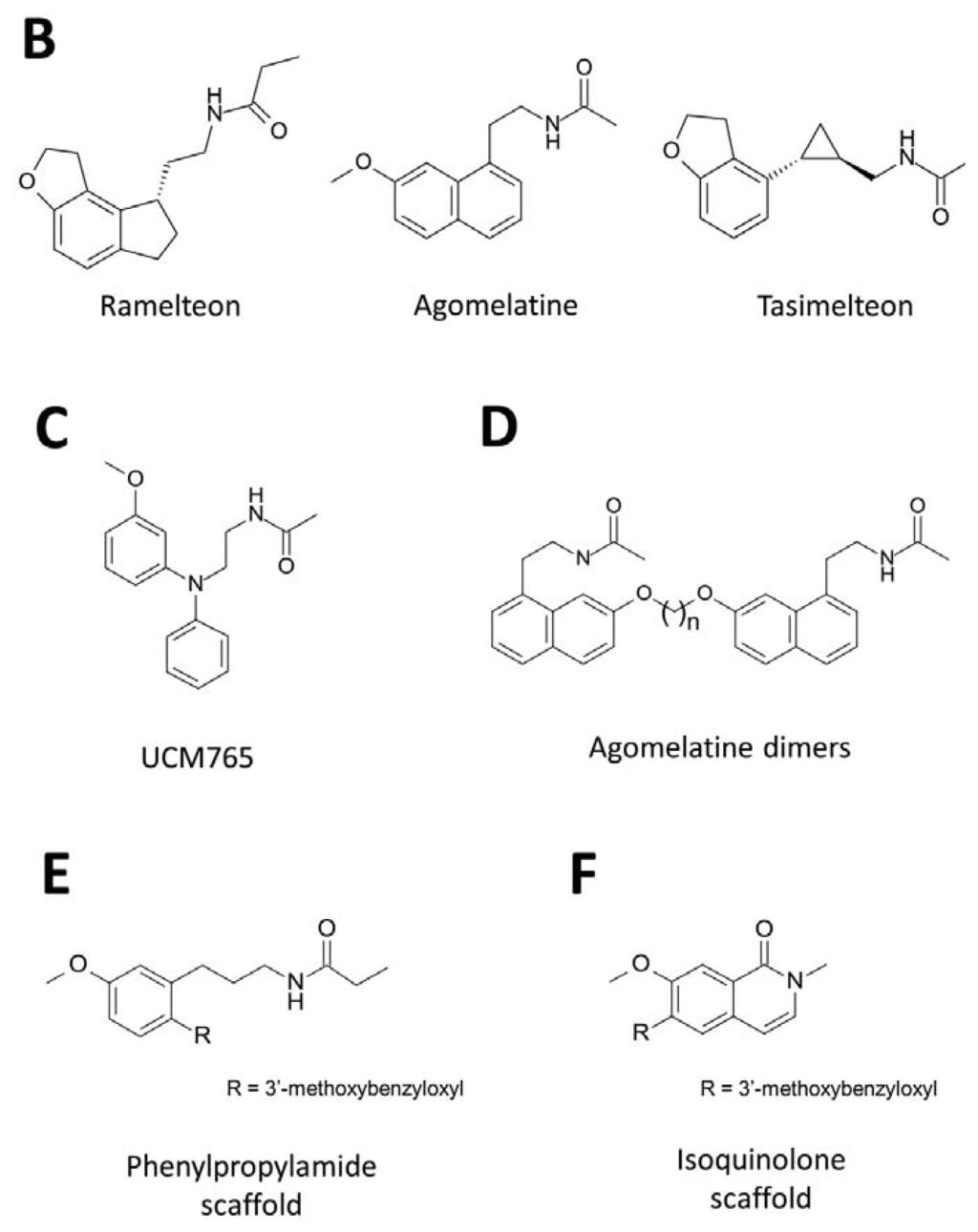 - Rivara, S.; Lodola, A.; Mor, M.; Bedini, A.; Spadoni, G.; Lucini, V.; Pannacci, M.; Fraschini, F.; Scaglione, F.; Sanchez, R.O.; et al. N-(substituted-anilinoethyl)amides: design, synthesis, and pharmacological characterization of a new class of melatonin receptor ligands. J. Med. Chem 2007, 50, 6618–6626. [Google Scholar]