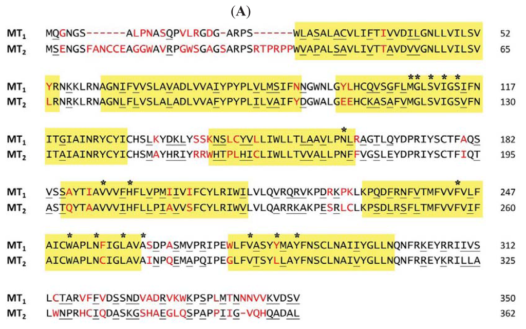 - Mazna, P.; Berka, K.; Jelinkova, I.; Balik, A.; Svoboda, P.; Obsilova, V.; Obsil, T.; Teisinger, J. Ligand binding to the human MT2 melatonin receptor: the role of residues in transmembrane domains 3, 6, and 7. BioChem. Biophys Res. Commun 2005, 332, 726–734. [Google Scholar]