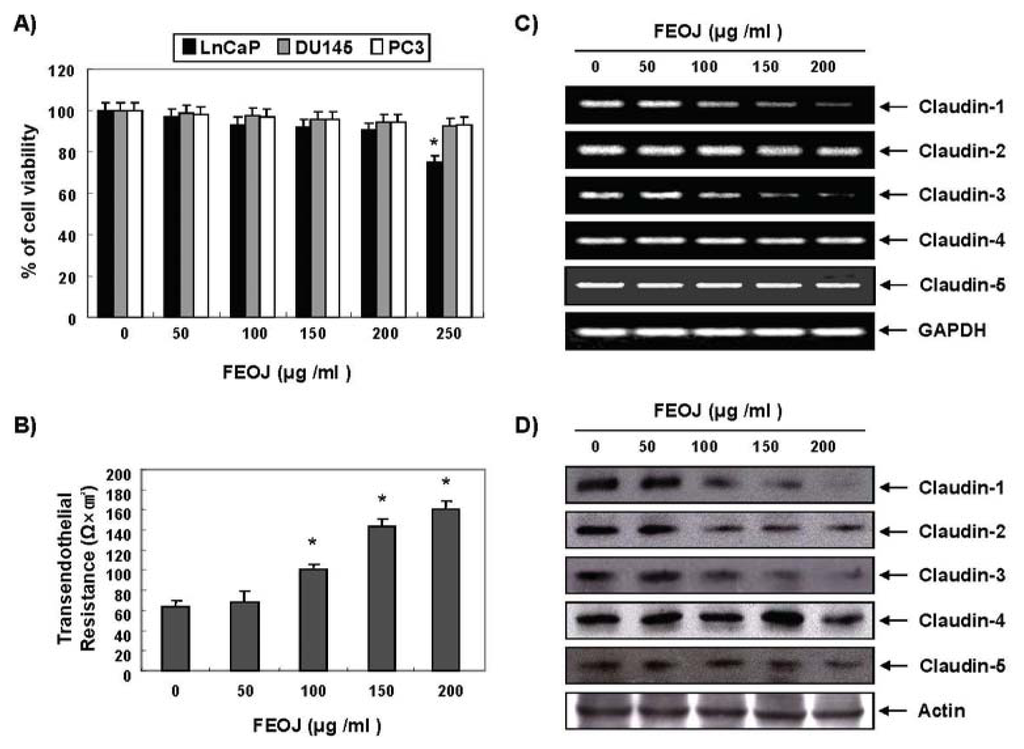 Tightening tight junctions (TJs) by flavonoids extracted from Orostachys japonicus (FEOJ) through suppression of the expressions of claudin-1 and claudin-3 at the transcriptional level in LnCaP human prostate cancer cells. Du145, LnCaP, and PC3 human prostate carcinoma cells were treated with FEOJ at the indicated concentrations for 48 h. (A) Cell viability was estimated by MTT assay; (B) TER values were measured. Each point represents the mean ± SD of three independent experiments. Significance was determined by the Student’s t-test (*p < 0.05 vs. control); (C) Total RNA was isolated and reverse-transcribed. Resulting cDNAs were then subjected to PCR. The reaction products were subjected to electrophoresis in a 1% agarose gel and visualized by EtBr staining. GAPDH was used as an internal control; and (D) Western blotting was performed using the indicated antibodies and an ECL detection system. Actin was used as an internal control. Data were representative of two independent experiments.