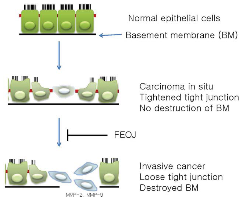Schematic representation on the anti-cancer effects of FEOJ in human prostate cancer cells. Tight junctions (TJs) and polarity of the normal cells become disorganized or lost during carcinogenesis from normal epithelial cells to cancer cells. To metastasize to farther regional nodes and distant organs, cells need to destroyed basement membrane (BM) and extracellular matrix (ECM). Matrix matalloproteinases (MMPs) play a critical role in ECM and BM degradation. Among them, MMP-2 and MMP-9 are important in metastasis. FEOJ suppresses cancer migration and invasion by suppressing MMPs and tightening TJs in LnCaP human prostate cancer cells.