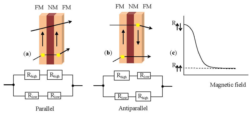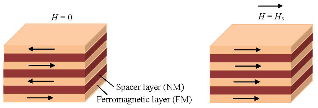 For the GMR effect in a magnetic multilayer structure to occur, one should be able to orient the magnetic moments of the magnetic layers parallel to each other by application of a magnetic field and antiparallel when the field is zero. This antiparallel alignment of the magnetization (Figure 2b) is accomplished by the interlayer exchange coupling [,]. This coupling is mediated by the mobile electrons in the non-magnetic (NM) layer similarly to Ruderman-Kittel-Kausya-Yosida (RKKY) interaction between localized magnetic moments present in a matrix of non-magnetic metal. This interlayer exchange coupling oscillates between ferro- and antiferromagnetic as a function of the thickness of the NM layer. Careful tuning of the thickness of the NM layer during fabrication leads to the desired antiparallel magnetization alignment at zero field.
