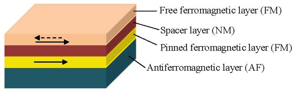 Another method to change the alignment of the magnetic moments in the magnetic layers is by tuning the coercivity of one of the FM layers to a higher value. This is achieved at the spin valve structures, which are also based on the GMR effect [,,,]. Specifically, one FM layer is pinned by the exchange coupling with an adjacent antiferromagnetic layer (see Figure 3) and the other unpinned FM layer is free to rotate with the externally applied field. This way, a parallel or antiparallel magnetization alignment is achieved []. Typically, a spin valve structure consists of four metallic layers; an antiferromagnetic pinning layer, a pinned magnetic layer, with a fixed magnetization by an exchange coupling field from the antiferromagnet, a conducting spacing layer (e.g., Cu) and a free magnetic layer whose magnetization rotates according to the signal field as shown in Figure 3 [,].