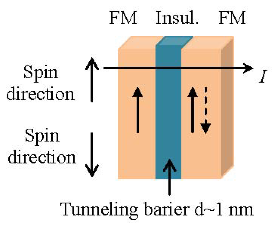 The tunneling MR effect (TMR) is a quantum mechanical phenomenon and it occurs in magnetic tunnel junctions (MTJ) which are structures consisting of two ferromagnetic layers separated by a very thin insulating layer []. In short, if the insulating barrier, which is between the two ferromagnetic electrodes, is thin enough (in the order of a few nanometers), the electrons can tunnel quantum mechanically through the insulating barrier; a tunnel current flows between the ferromagnetic layers (see Figure 4).