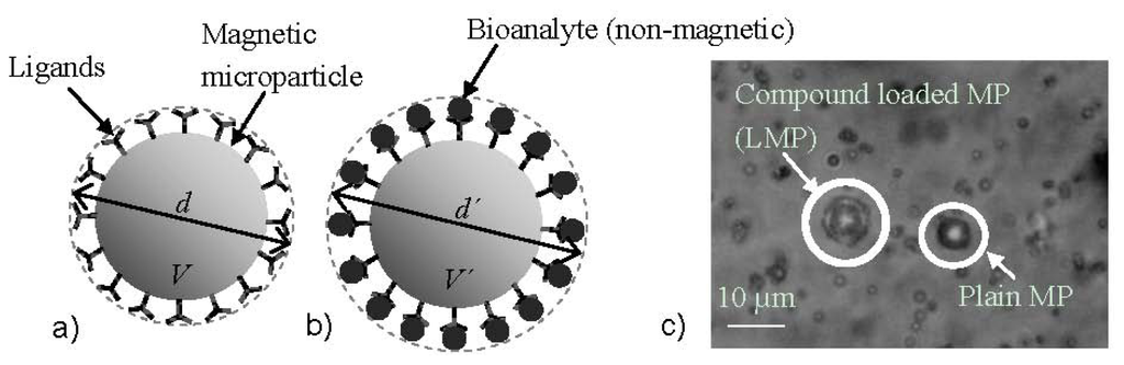 (a) Magnetic microparticle coated with ligands having an aggregate diameter d and a volume V and (b) Magnetic microparticle coated with ligands and attached bioanalyte of total diameter d′ and total volume V′; (c) Micrograph of the plain magnetic microparticles with a diameter d of app. 6.2 μm (MP), and the same streptavidin coated, magnetic microparticles attached to biotin coated, polystyrene microparticles (of app. 0.98 μm diameter dp) with a total diameter d′ of app. 8.2 μm (LMPs) [].