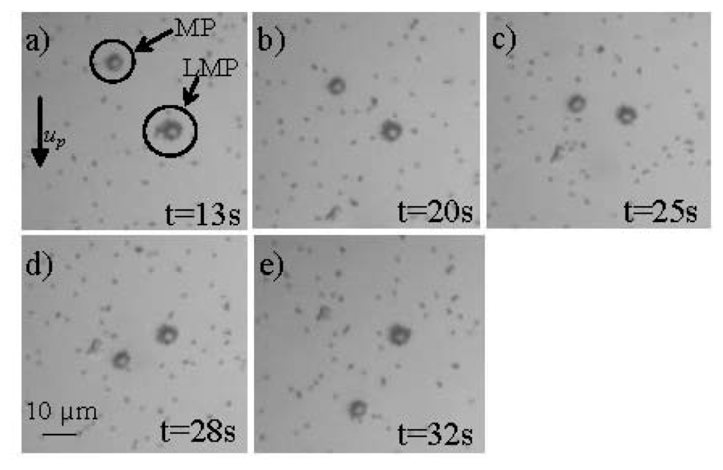 Optical microscope images of a typical measurement of the movement of the plain MPs and the LMPs (described in Figure 6) inside the microfluidic channel (up velocity of MPs) when accelerated by an external magnetic field at (a) 13 s; (b) 20 s; (c) 25 s; (d) 28 s; (e) 32 s [].