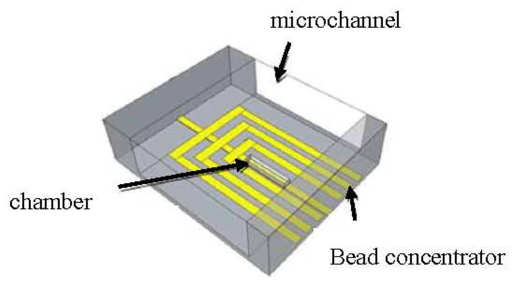 Schematic of the device consisting of the microchannel, the bead concentrator, and the chamber with gold microstructure underneath [].
