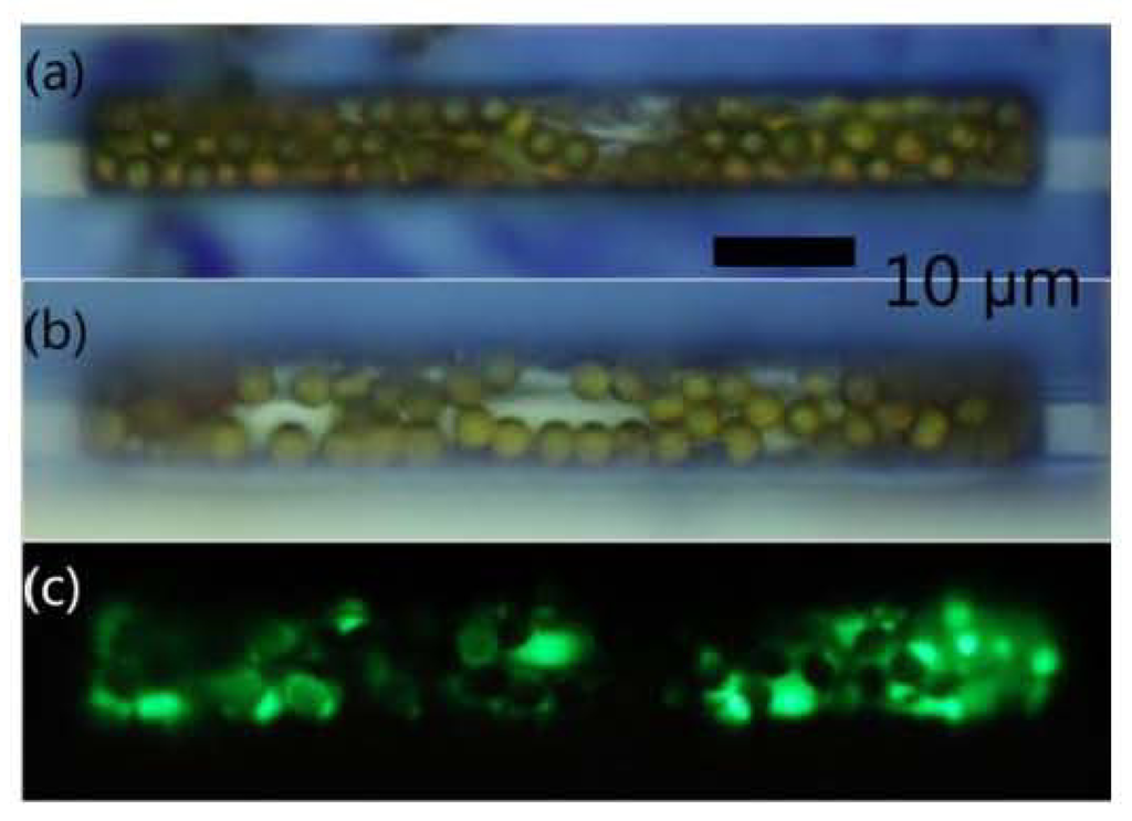 (a) About 60 magnetic particles trapped inside the chamber; (b) About 44 magnetic particles with BSA and fluorescent markers trapped; (c) Fluorescent markers in the trap [].