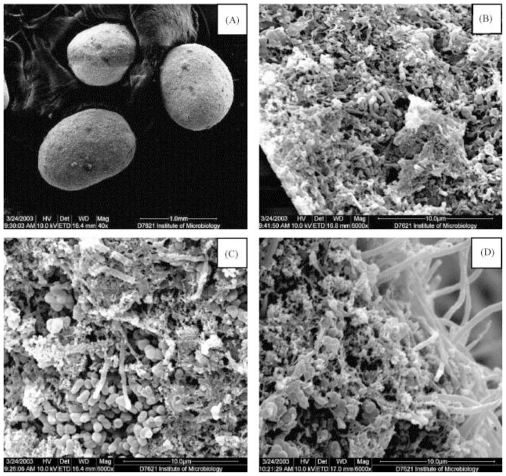 Scanning electron micrographs of anaerobic granular sludge cultivated in an Expanded Granular Sludge Bed (EGSB) reactor. (A) Morphology of anaerobic granules used (40× magnification); (B,C,D) Inner structure of anaerobic granules (6000× magnification). Reprinted from [23], Process Biochemistry, Vol. 40, Wang, J. and Kang, J., The characteristics of anaerobic ammonium oxidation (ANAMMOX) by granular sludge from an EGSB reactor, Pages 1973–1978, Copyright (2005), with permission from Elsevier.