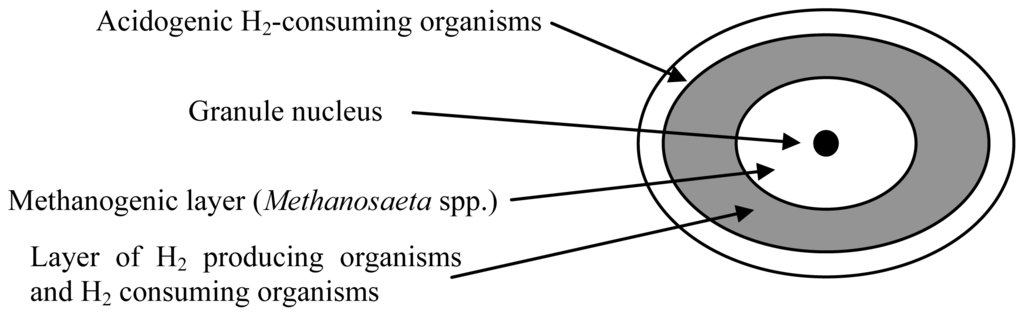 Granular biomass formation by archaeal populations has been widely studied in anaerobic digestion processes [22,35,37–41,44–49]. From the technological point of view, these systems comprise mainly the UASB and expanded granular sludge bed (EGSB) reactors [28]. In 2003, McHugh et al. [50] proposed a layered structure for the anaerobic granules in which a central core of acetoclastic methanogens is surrounded by a layer of hydrogen- or formate-producing acetogens and hydrogen- or formate-consuming methanogens. The proposed granule structure provides an outside layer of microorganisms that hydrolyze and acidify complex organic matter [51] (Figure 2). Once the reactors have been seeded with anaerobic sludge and wastewater, the wastewater flows in the upward direction through the sludge and granule formation slowly occurs spontaneously under appropriate conditions of substrate and nutrient availability, pH, alkalinity, and upflow velocity [26].