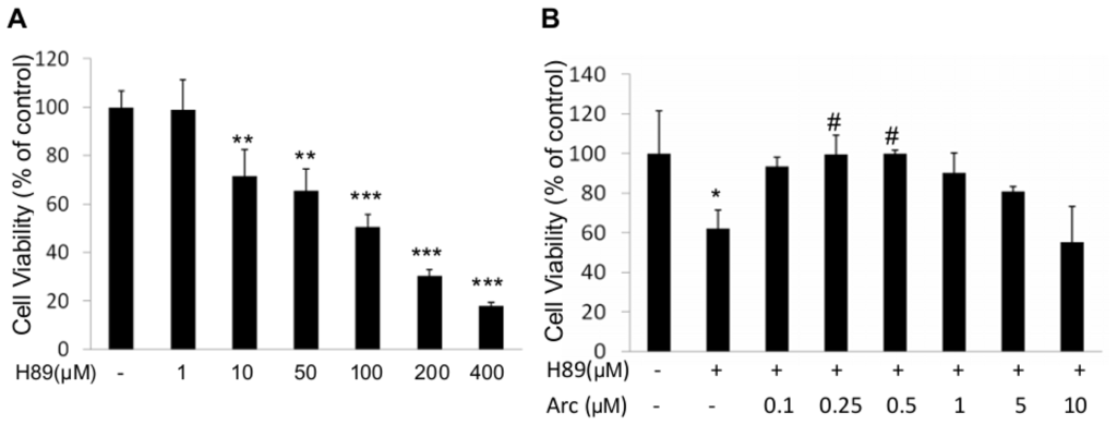 2.1. Arc Protects Human SH-SY5Y Cells from H89-Induced Reduction of Cell Viability
