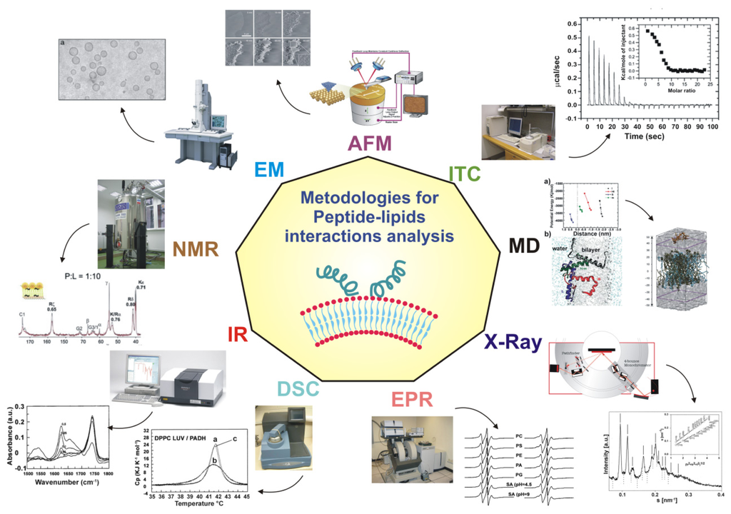 The binding, location and orientation of a peptide relative to a lipid bilayer as well as lipid rearrangements in the presence of peptides are the most important features of peptide-lipid interactions. During the last decades, several experimental techniques have been developed and applied to biological systems, which differ in the nature and size of the sample, the sensitivity and the type and resolution of the information that they can provide. This section describes some of the most recent and significant methodologies which are usually combined in biophysical studies of membrane interacting peptides, since they provide complementary information (Figure 1).